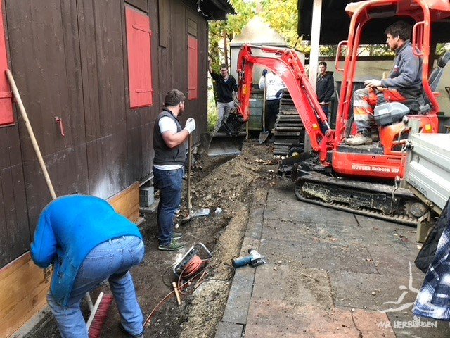 Da es immer wieder mal bei starkem Regen Probleme mit dem Wasserabfluss gab, wurde eine Sickerleitung eingebaut, um so künftig Schäden an der Hütte zu verhindern. Gleichzeitig wurde der Tag genutzt um der Hütte einen neuen Anstrich zu verpassen oder andere kleinere Reparaturen durchzuführen. Dank erfahrenen eigenen Baufachleuten, konnten alle Arbeiten selber erledigt werden. Zum Schluss wurden dann auch die zuvor entfernten Gehwegplatten wieder neu verlegt. Nachstehend findet Ihr einige Bilder von diesem Anlass. An dieser Stelle ein herzliches Dankeschön allen Helfern.